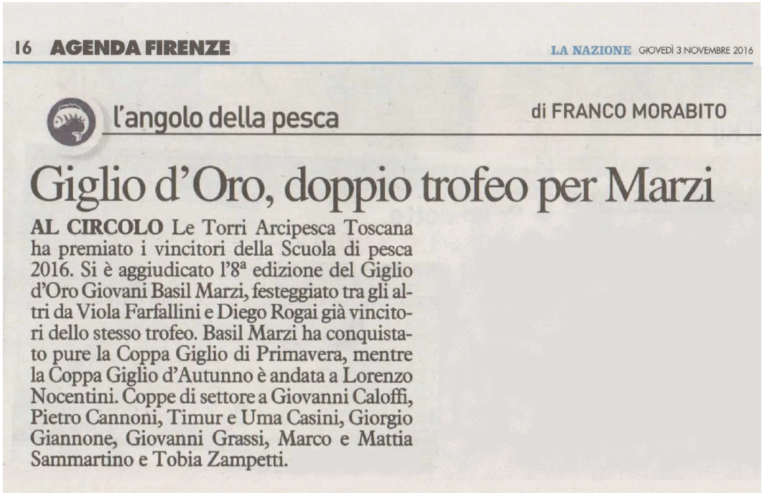 mercoledì, Novembre 2nd, 2016Nella sede del Circolo Le Torri si è tenuta la premiazione della Scuola di Pesca di Firenze a conclusione dei corsi programmati per l’anno 2016. La premiazione è stata preceduta da un minuto di raccoglimento in memoria di Ivo Stoppioni titolare della ditta Stonfo recentemente scomparso.
