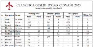 Vincitore del Trofeo Giglio d’Oro Giovani 2025 è risultato Federico Sibilia che con sole 3 penalità si è piazzato al primo posto della classifica generale ad appena 1 penalità di distacco da Leone Pacini. Al terzo posto Marco Lizzeri.