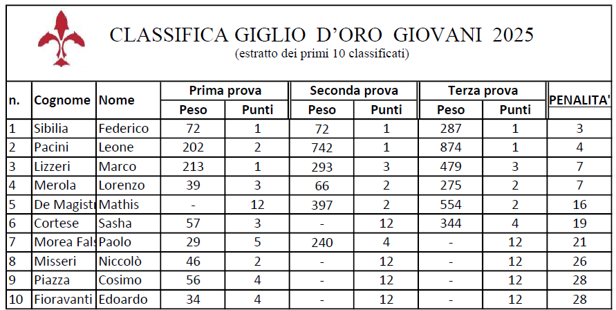 Vincitore del Trofeo Giglio d’Oro Giovani 2025 risulta Federico Sibilia che con sole 3 penalità si è piazzato al primo posto della classifica generale ad appena 1 penalità di distacco da Leone Pacini. Al terzo posto sul podio Marco Lizzeri (7 penalità). Limitatamente ai primi 10 posti della classifica generale, seguono nell’ordine: Lorenzo Merola (stesse penalità di Lizzeri ma minor peso), Mathis De Magistris, Sasha Cortese, Paolo Morea Falsini, Niccolò Misseri, Cosimo Piazza, Edoardo Fioravanti.